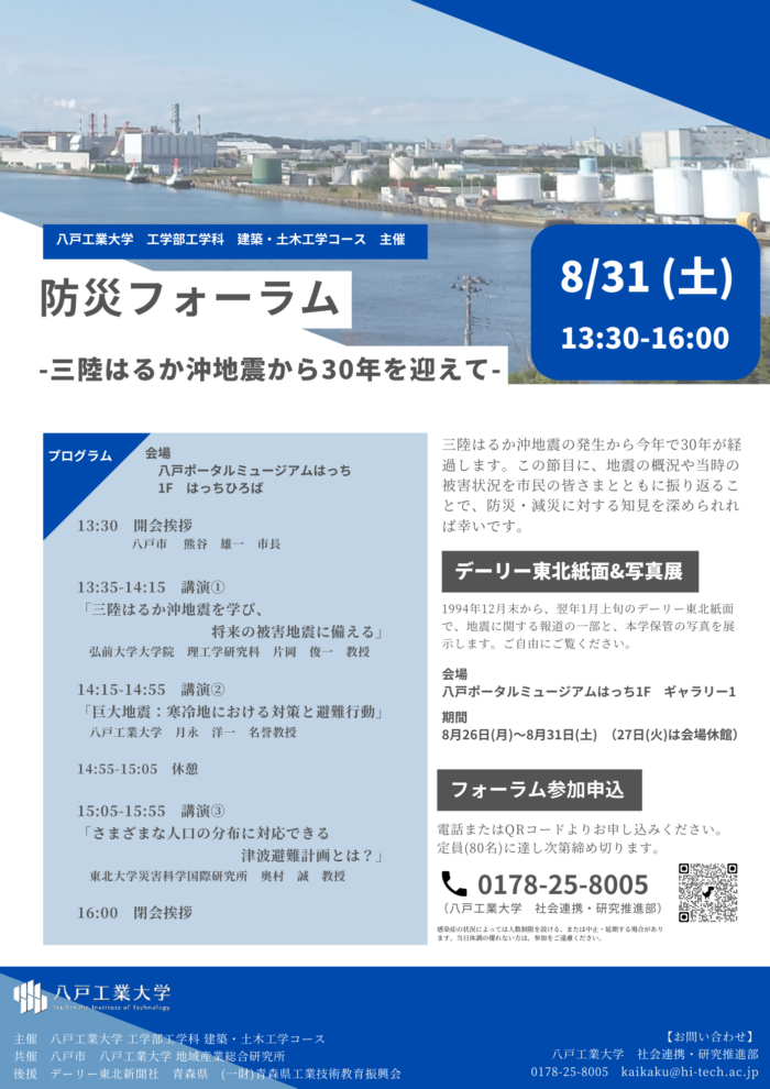 三陸はるか沖地震の発生から30年が経過する節目に、以下のとおり防災フォーラムを開催いたします。地震の概況や当時の被害状況を振り返り、防災・減災に対する知見を深める機会となれば幸いです。また、フォーラムにあわせて、当時のデーリー東北紙面や本学保管の写真データなどを展示いたします。