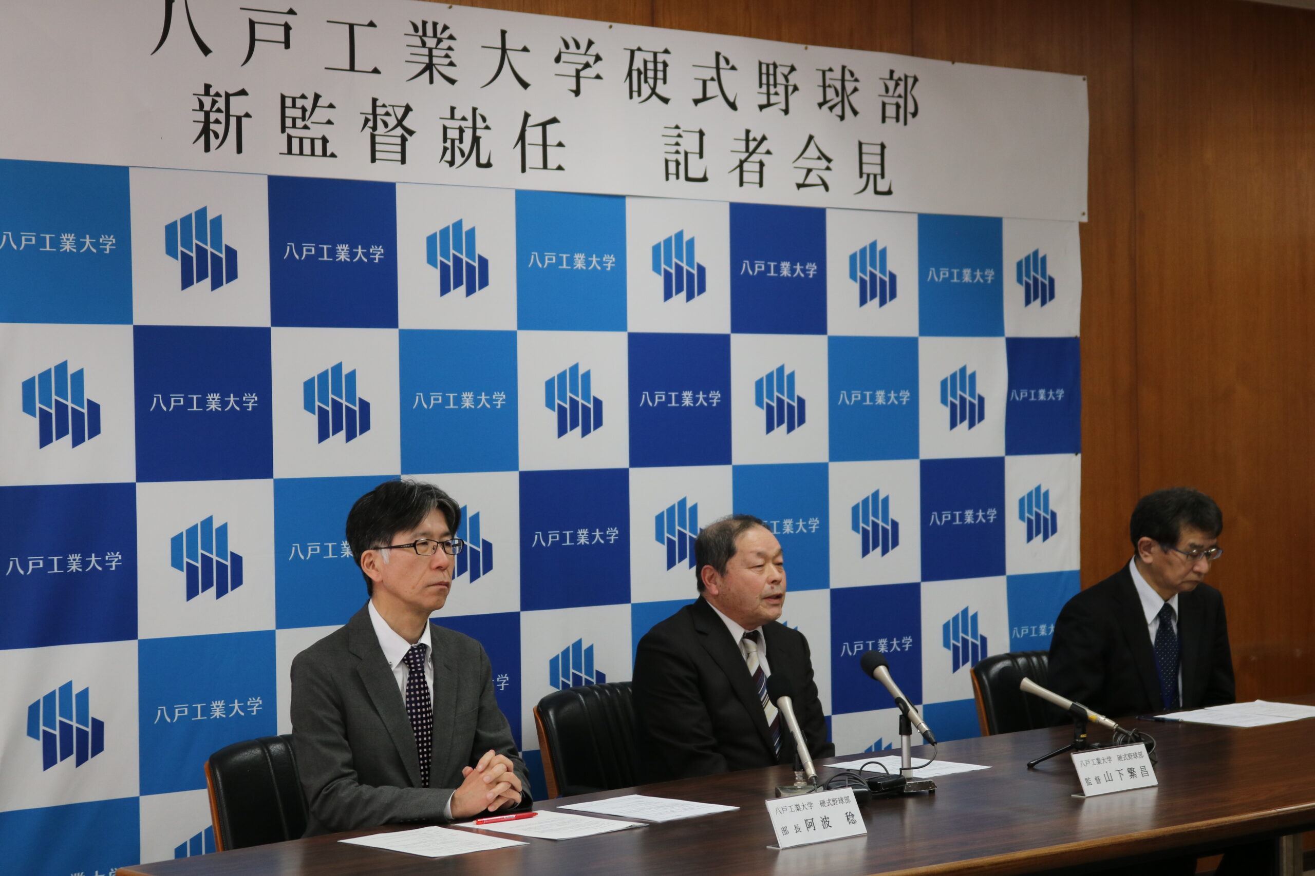 3月6日(木)、学内にて就任会見を行いました。初めに硬式野球部部長の阿波稔 学長補佐が就任の経緯を説明。専任の指導者によるチーム力向上を期待しました。山下繫昌監督は今回の就任について「1部リーグ昇格という一つの目標に向かって一緒に戦っていきたい」と抱負を語りました。すでに新体制で練習が始まっており、選手の取り組み方に期待を感じているそう。自身の野球に対する考え方である「機動力を活かした攻めの野球」をもとに、実戦への準備を進めています。