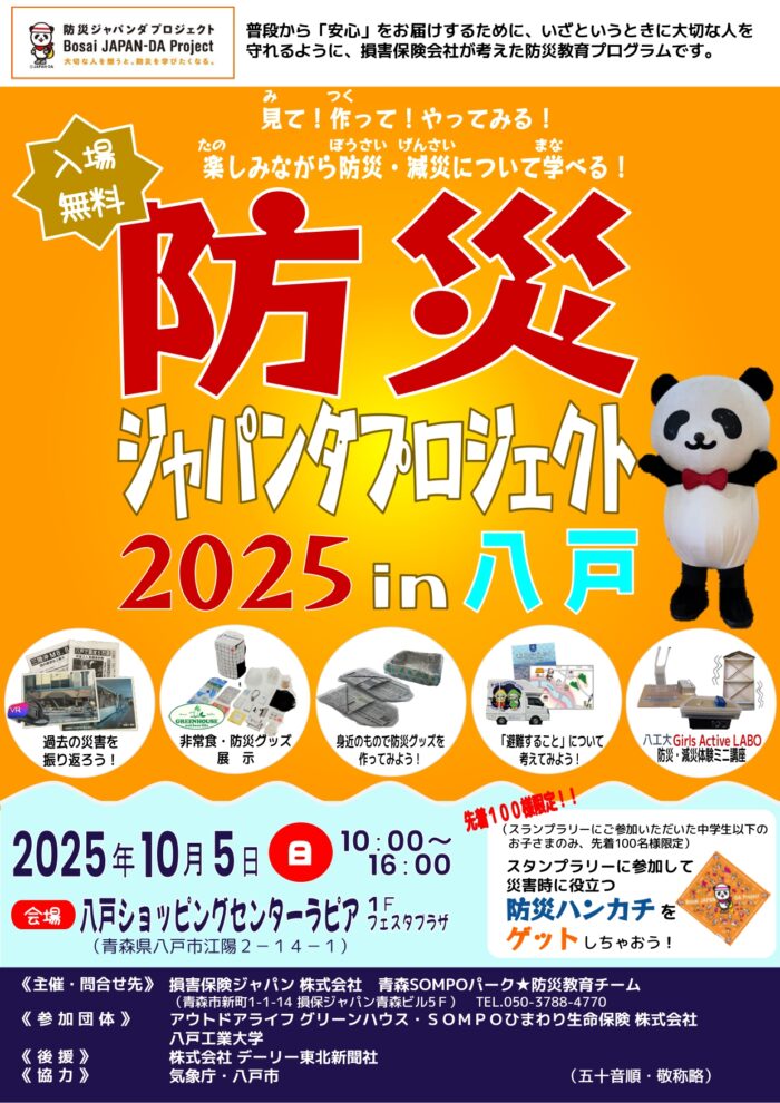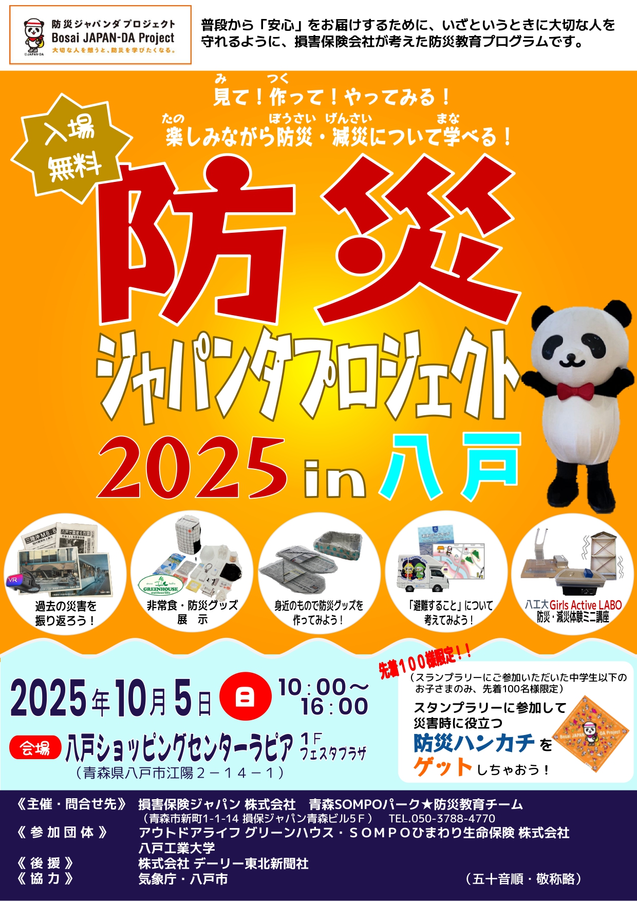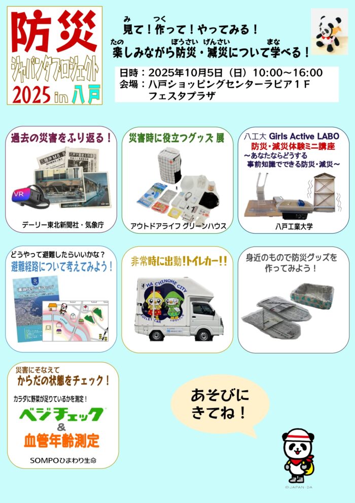 10月5日(日)、ラピア1F フェスタプラザにて開催される『防災ジャパンダプロジェクト2025 in 八戸』(主催・損害保険ジャパン株式会社)にブース参加します。本学は、Girls Active LABOが「防災・減災体験ミニ講座~あなたならどうする 事前知識でできる防災・減災」として、工作キットを使った体験講座を提供します。ぜひお立ち寄りください!