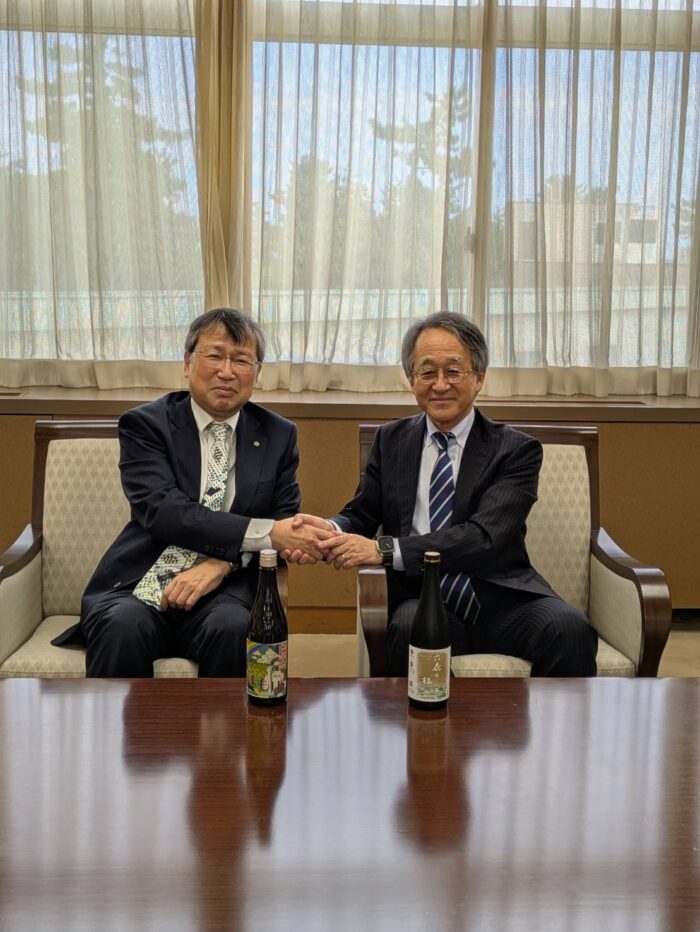 10月7日(火)に、本学 船﨑学長が牛木辰夫新潟大学長を表敬訪問しました。牛木学長と船﨑学長は高校(新潟県立高田高校)の同級生で、旧知の間柄です。牛木学長は、2020年に学長に就任以来、学内の教育研究制度の改革に取り組まれ、特に二つの研究科を横断する文理融合的な学びとして「大学院日本酒学プログラム」を設置するなど、新潟大学を象徴する特徴的な教育研究改革を進めてこられました。船﨑学長は八戸工業大学における教育研究の改革の方向性を説明し、牛木学長と1時間にわたり意見交換を行いました。