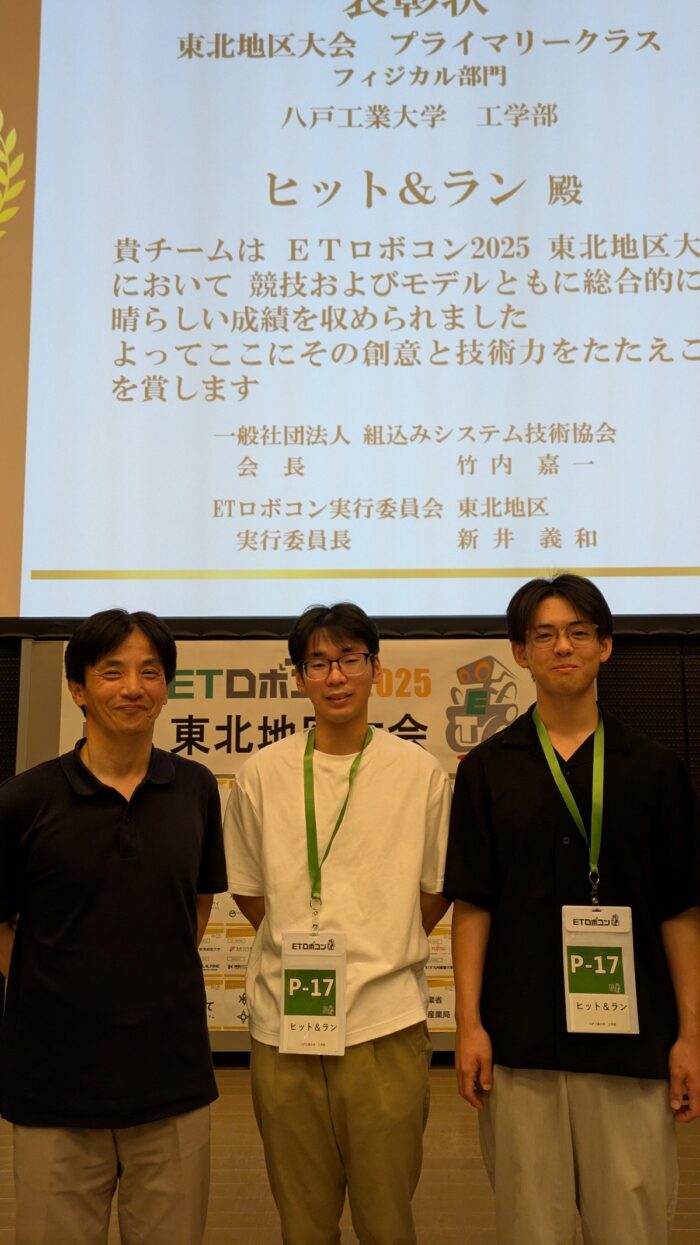 9月20日(土)に開催されたETロボコン2025東北地区大会において、工学部工学科(システム情報工学コース)山口広行准教授の研究室チーム〈ヒット&ラン〉が、「総合優勝」に輝き、「競技優勝」「ゴールドモデル賞」「IPA賞」も受賞しました。11月に開催される全国大会への出場権も獲得。全国大会への出場は、4年連続8度目となります。