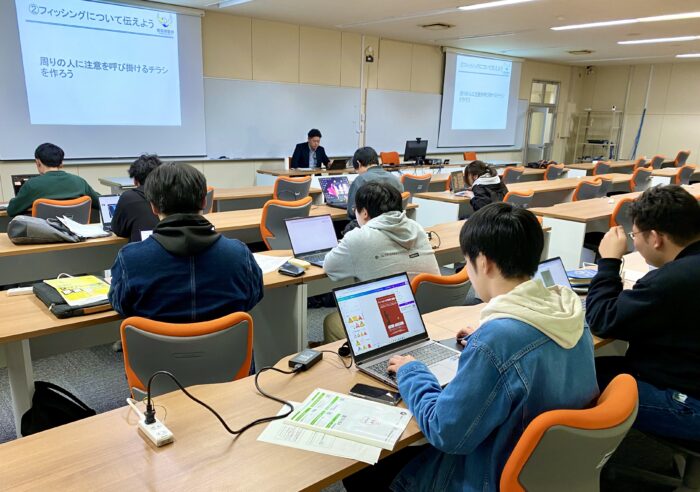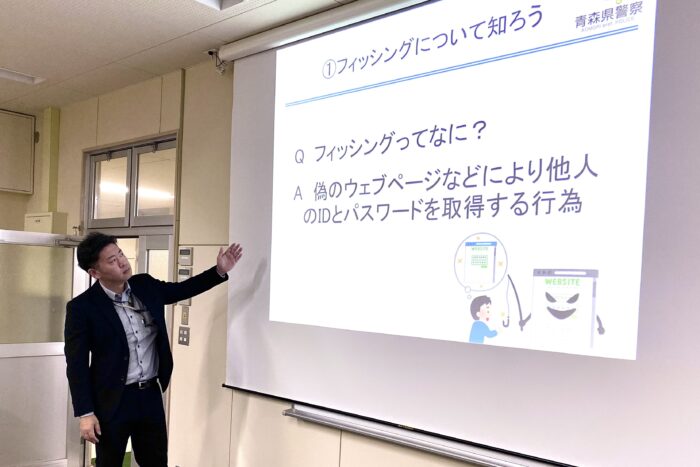 10月23日(木)、本学にて青森県警による「フィッシング被害防止のためのワークショップ」が開催されました。工学部工学科(システム情報工学コース)の学生9名が参加し、警察の方から、昨今被害がたくさん発生している「フィッシング詐欺」、いわゆる偽サイトを中心に、最新の詐欺被害や対策についてお話いただきました。ワークショップで学生たちは、詐欺の危険を訴えるポスターも作成。今後、学内に掲示するなど、危険性や対策を周知していく予定です。 (2025年10月24日 掲載)