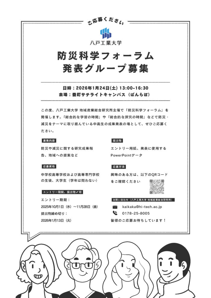 この度、八戸工業大学 地域産業総合研究所主催で「防災科学フォーラム」を開催する運びとなりました。例年、防災・減災に対する意識を高める機会として講演を実施しておりましたが、15回目を節目に趣向を変え、中高校生が「総合的な学習の時間」や「総合的な探究の時間」などで取り組んだ研究成果を発表する場を設けることといたしました。下記をご参照の上、積極的なご参加をお待ちしております。