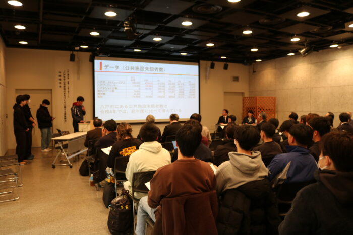 11月28日(金)、八戸ポータルミュージアム はっちにて「八戸市中心市街地のまちづくりに関する課題解決」中間報告会が開催されました。工学部工学科 建築・土木工学コースの3年生が出席し、6班に分かれて発表を行いました。