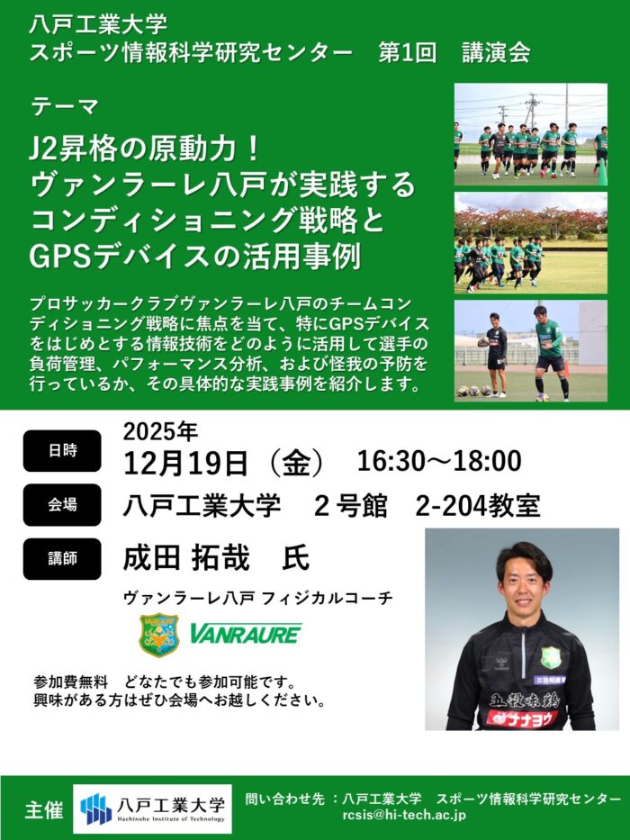 ヴァンラーレ八戸トップチームフィジカルコーチの成田氏をお招きし、トップチームのチームコンディショニングに焦点を当て、特にGPSデバイスをはじめとする情報技術をどのように活用して選手の負荷管理、パフォーマンスの分析、および怪我の予防を行っているのか、その具体的な実践事例を紹介していただきます。