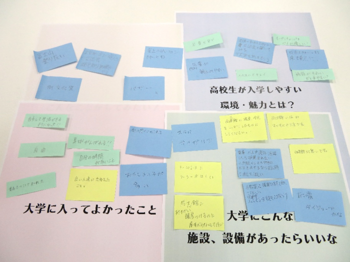 グループごとに、上記の4つのお題に対し、付箋にアイディアを書き出し、船﨑学長と意見交換を行いました。弾けるような笑いが起こるなど、終始和やかな雰囲気の中、懇談会は終了しました。