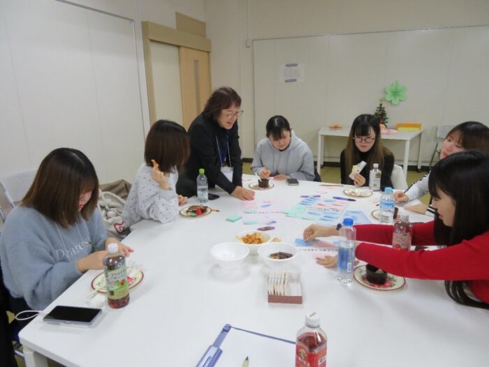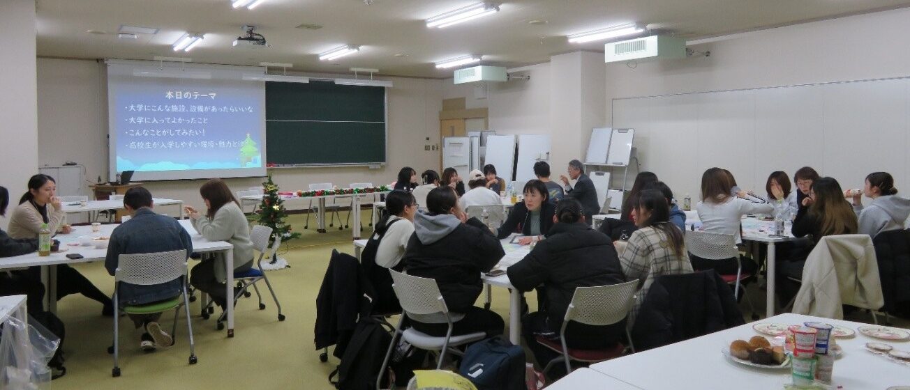 第4回は、「船﨑学長と女子学生とのクリスマスパーティー」と題し、『女子学生にとってより良い大学づくりとは』のテーマのもと、4グループに分かれて実施しました。今回、女子学生21名、船﨑健一 学長、女性職員9名に参加いただきました。