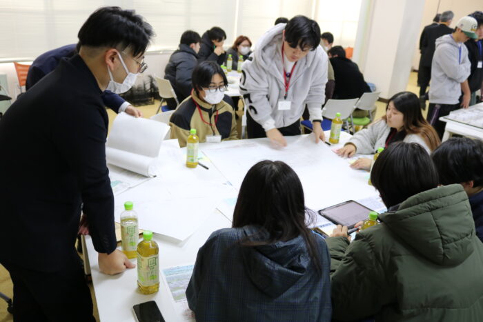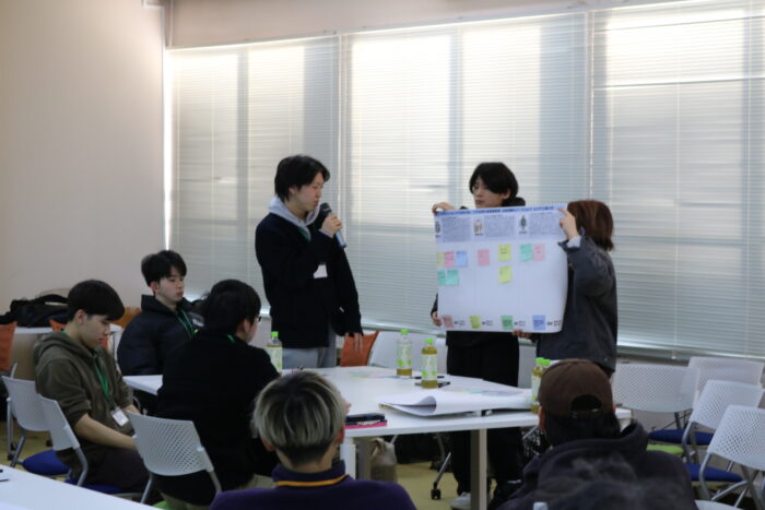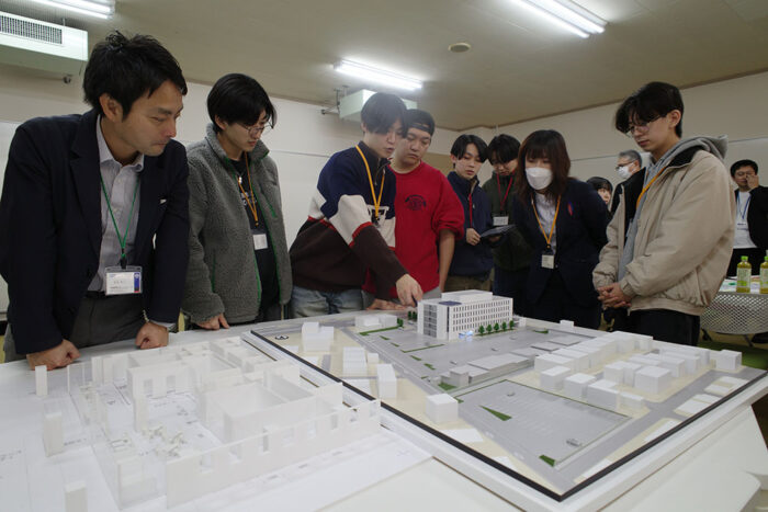 参加したのは建築・土木工学コースの3年生と4年生です。学生は事業や工事の内容などを聞いた後、6班に分かれてグループワークを実施。建築士や大学生といった立場の違うペルソナが設定され、利用者ごとの使いやすさや過ごしやすさについて意見交換しました。