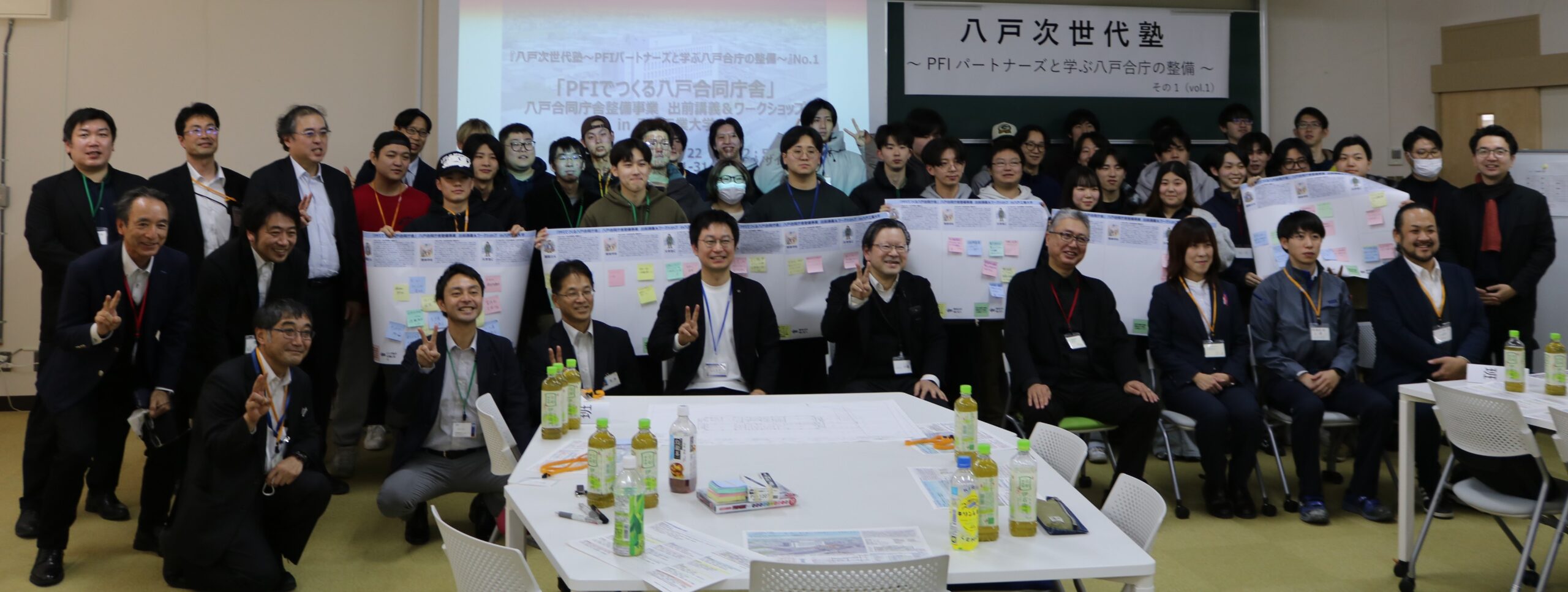 12月22日(月)、『八戸次世代塾~PFIパートナーズと学ぶ八戸合庁の整備~』No.1と題して、八戸合同庁舎を題材とした産学官連携ワークショップを実施しました。現在同庁舎は建て替えの検討がされており、新庁舎の建設が始まっています。今回は、青森県庁と事業の特別目的会社(清水建設・佐藤総合計画・八洲建築設計・穂積建設工業・三菱電機ビルソリューソンズ・三八五流通)の解説を聞き、合同庁舎のより良いあり方について意見交換を行いました。