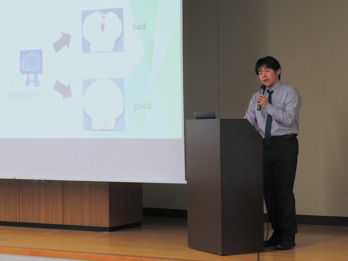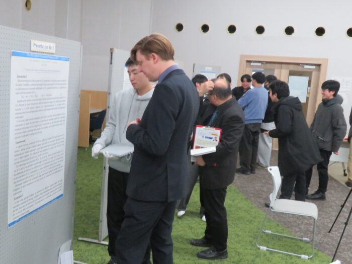 この日のセミナーでは、基礎教育研究センターの岩見一郎教授による本学での指導実践紹介、Lynch氏による理系の英語プレゼンテーションに関する講演・レクチャーに続いて、5名の大学院生が英語で自身の研究内容を紹介しました。また、セミナー全体を通しての司会は2名の大学院生が務め、締め括りには基礎教育研究センター長の佐々木崇徳教授から講評が、閉講式では船﨑健一学長から挨拶があり、全て英語で行われました。さらにセミナー終了後には、発表者が掲示ポスター前で参加者と交流する機会も設けられました。