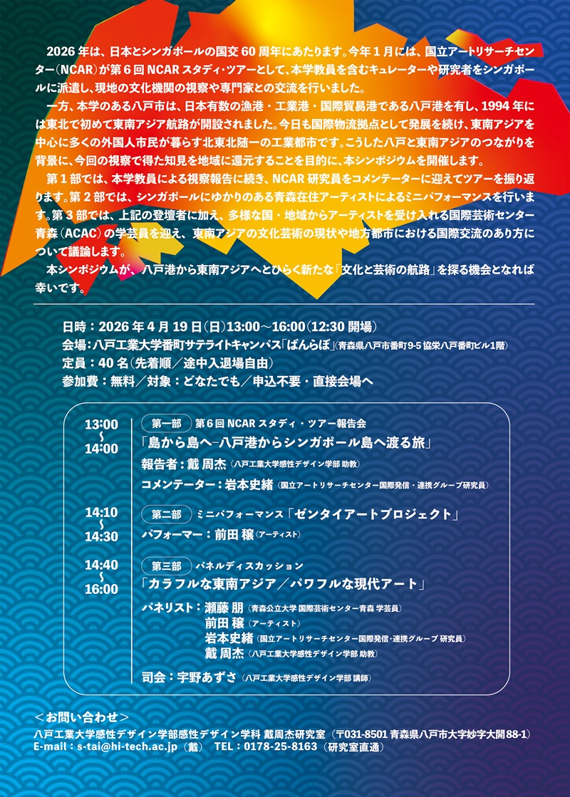 本事業のきっかけは、戴助教が本年1月に独立行政法人国立美術館 国立アートリサーチセンター(NCAR)主催の「NCARスタディ・ツアー」に、東北地方の専門家として唯一選出され、シンガポールで8泊9日の調査研修を行ったことにあります。 2026年は日本とシンガポールの国交60周年の節目です。東南アジア航路を有する国際貿易港・八戸の特性を踏まえ、研修で得た知見を地域に還元し、地方都市における国際交流と文化芸術の可能性を議論します。