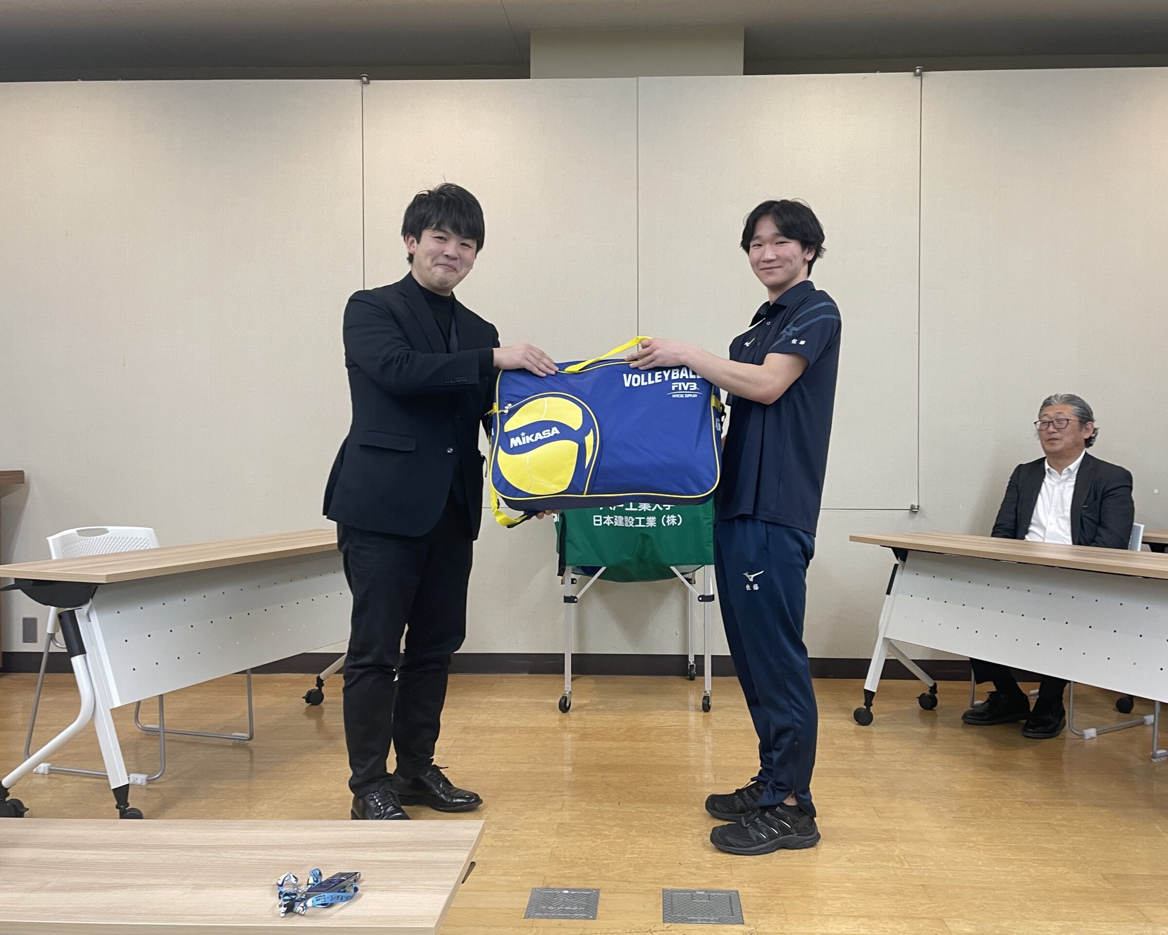 このたびご支援をいただいた日本建設工業株式会社の主任 岩木 拓巳 様は、昨年初めてバレーボールの試合を生で観戦され、その迫力と魅力に深い感銘を受けられたとのことです。「本年度もバレーボール部のさらなるご活躍を期待しております」とのお言葉を頂戴いたしました。