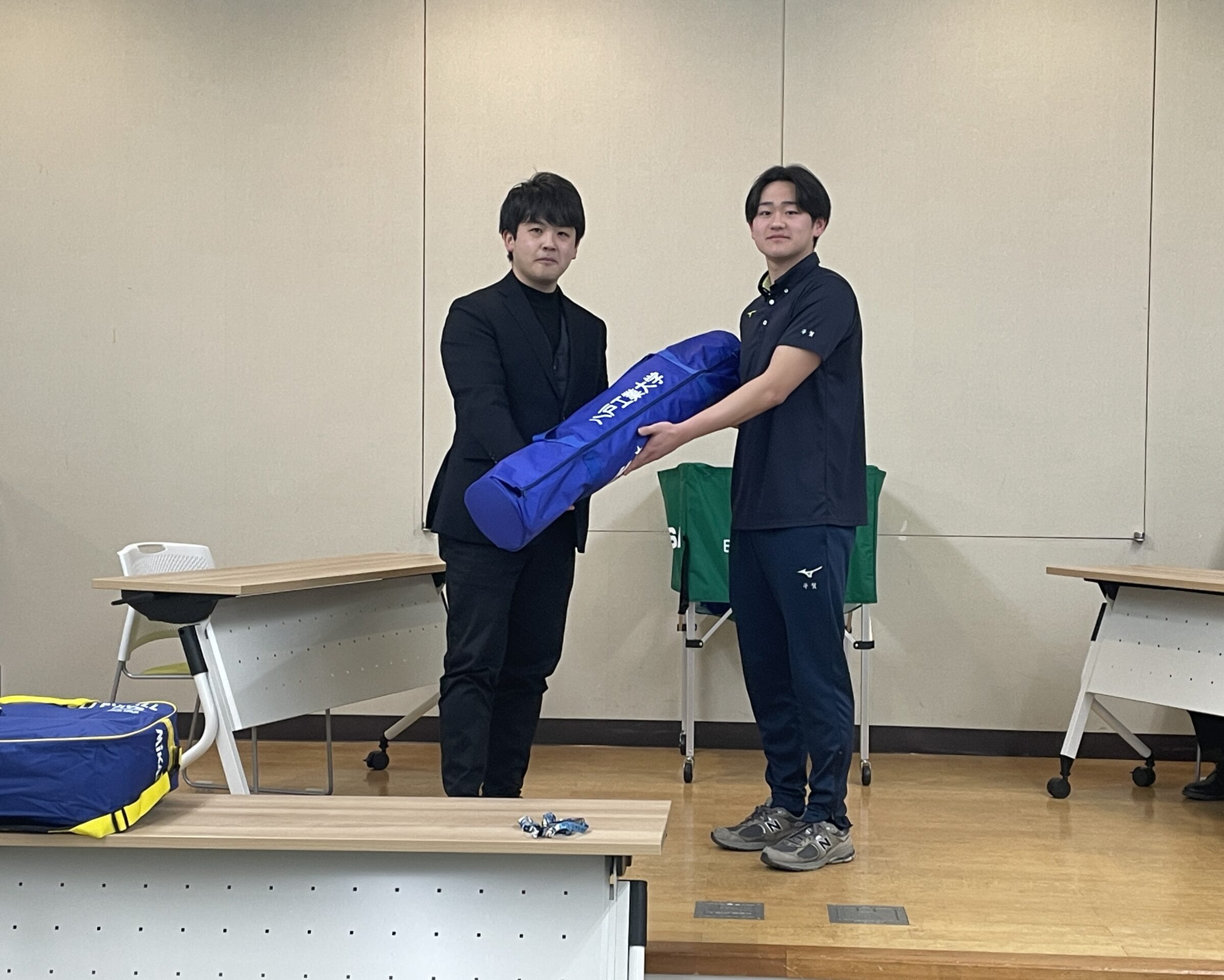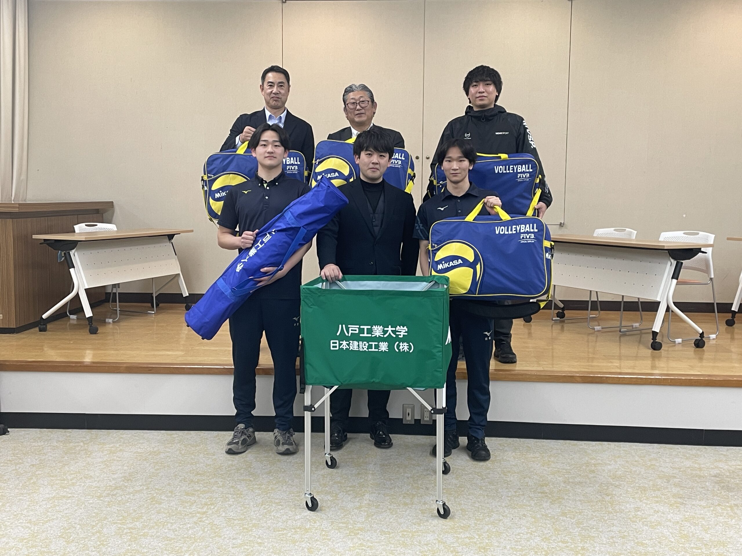 八戸工業大学バレーボール部は、昨年度に引き続き、日本建設工業株式会社様よりバレーボールおよびボールカゴのご寄贈を賜りました。