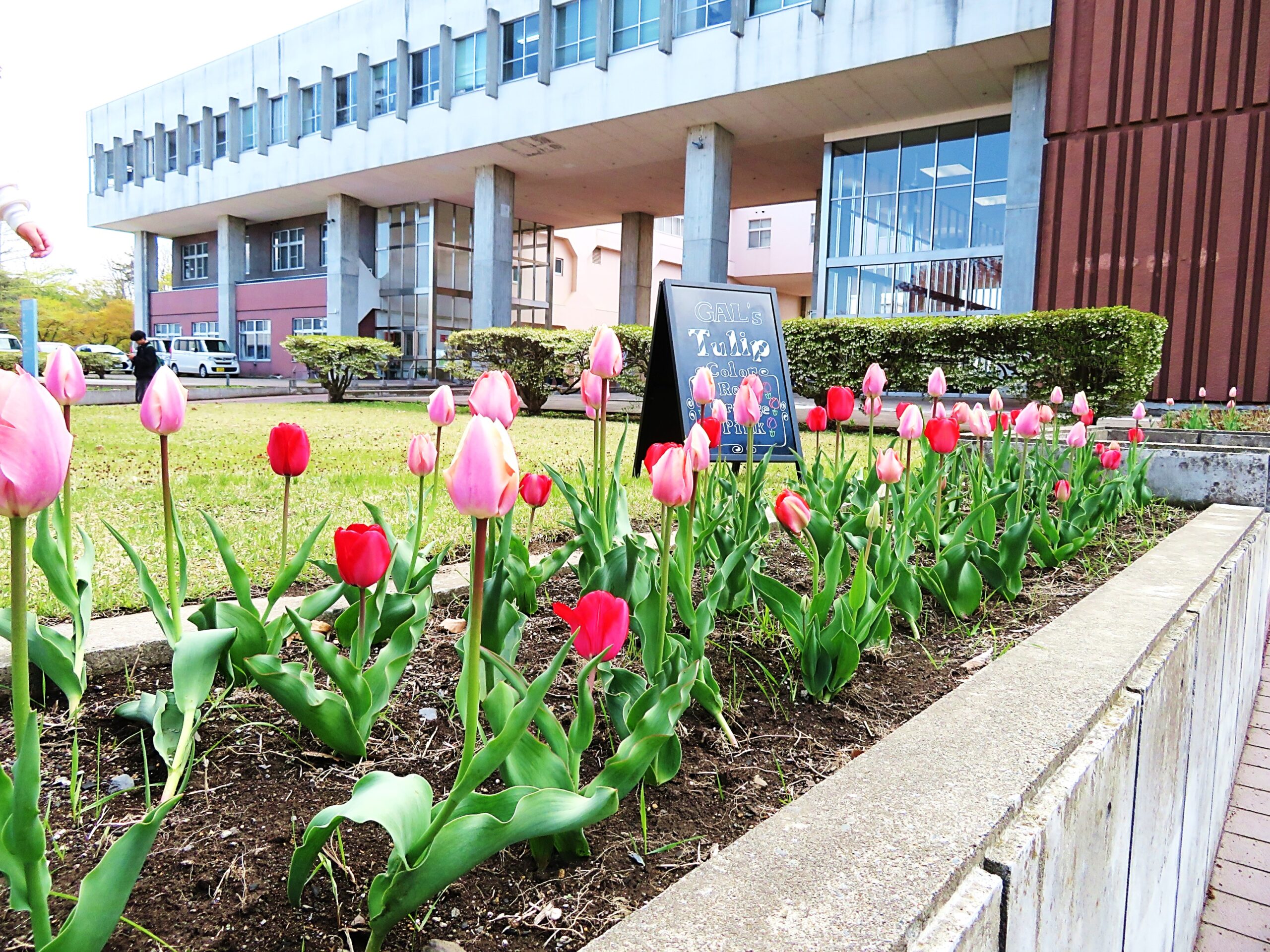 「Girls Active LABO」のメンバーが、キャンパスに彩りをつくることを目的として、本学キャンパスの1号館と2号館の間にある花壇及び新聞閲覧室付近のプランターに植えたチューリップが開花しました!