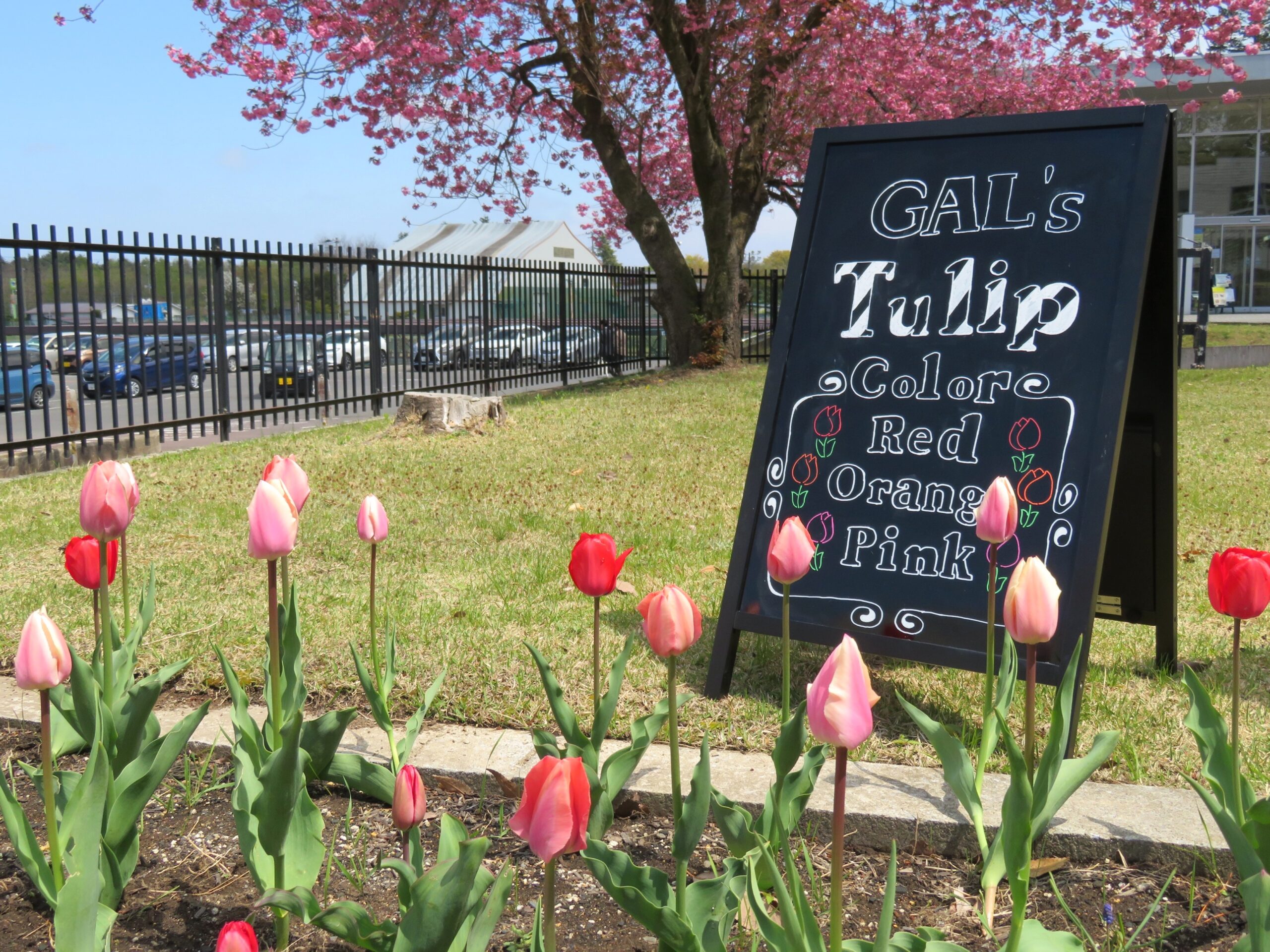 色とりどりのチューリップとともに、学生たちの感性が光る手作りの看板やラベルが、キャンパスをより鮮やかで温かみのある空間へと彩っています。